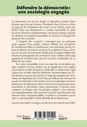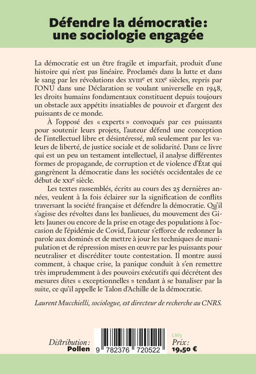 La démocratie est un être fragile et imparfait, produit d’une histoire qui n’est pas linéaire. Proclamés dans la lutte et dans le sang par les révolutions des xviiie et xixe siècles, repris par l’ONU dans une Déclaration se voulant universelle en 1948, les droits humains fondamentaux constituent depuis toujours un obstacle aux appétits insatiables de pouvoir et d’argent des puissants de ce monde.<br /> À l’opposé des «â¯experts⯻ convoqués par ces puissants pour soutenir leurs projets, l’auteur défend une conception de l’intellectuel libre et désintéressé, mû seulement par les valeurs de liberté, de justice sociale et de solidarité. Dans ce livre qui est un peu un testament intellectuel, il analyse différentes formes de propagande, de corruption et de violence d’État qui gangrènent la démocratie dans les sociétés occidentales de ce début de xxie siècle.<br /> Les textes rassemblés, écrits au cours des 25 dernières années, veulent à la fois éclairer sur la signification de conflits traversant la société française et défendre la démocratie. Qu’il s’agisse des révoltes dans les banlieues, du mouvement des Gilets Jaunes ou encore de la prise en otage des populations à l’occasion de l’épidémie de Covid, l’auteur s’efforce de redonner la parole aux dominés et de mettre à jour les techniques de manipulation et de répression mises en oeuvre par les puissants pour neutraliser et discréditer toute contestation. Il montre aussi comment, à chaque crise, la panique conduit à s’en remettre très imprudemment à des pouvoirs exécutifs qui décrétent des mesures dites «â¯exceptionnelles⯻ tendant à se banaliser par la suite, ce qu’il appelle le Talon d’Achille de la démocratie.<br /><br /><br /> Laurent Mucchielli, sociologue, est directeur de recherche au CNRS.
