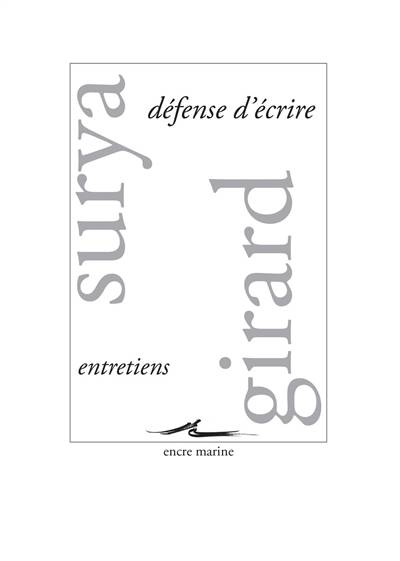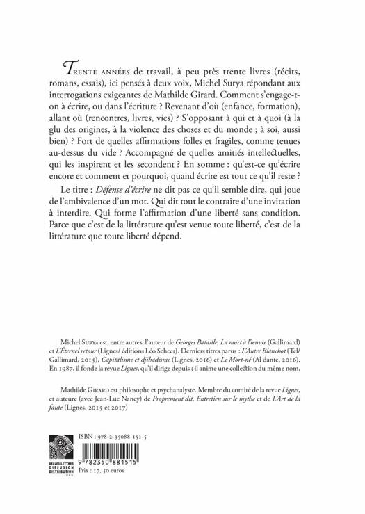 Trente annees de travail, a peu pres trente livres (recits, romans, essais), ici penses a deux voix, Michel Surya repondant aux interrogations exigeantes de Mathilde Girard. Comment s'engage-t-on a ecrire, ou dans l'ecriture ? Revenant d'ou (enfance, formation), allant ou (rencontres, livres, vies) ? S'opposant a qui et a quoi (a la glu des origines, a la violence des choses et du monde; a soi, aussi bien) ? Fort de quelles affirmations folles et fragiles, comme tenues au-dessus du vide ? Accompagne de quelles amities intellectuelles, qui les inspirent et les secondent ? En somme: qu'est-ce qu'ecrire encore et comment et pourquoi, quand ecrire est tout ce qu'il reste ? Le titre: Defense d'ecrire ne dit pas ce qu'il semble dire, qui joue de l'ambivalence d'un mot. Qui dit tout le contraire d'une invitation a interdire. Qui forme l'affirmation d'une liberte sans condition. Parce que c'est de la litterature qu'est venue toute liberte, c'est de la litterature que toute liberte depend.