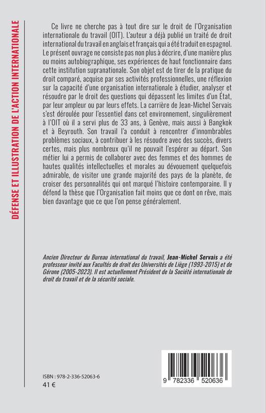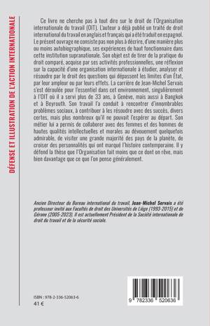 Ce livre ne cherche pas à tout dire sur le droit de l'Organisation internationale du travail (OIT). L'auteur a déjà publié un traité de droit international du travail en anglais et français qui a été traduit en espagnol. Le présent ouvrage ne consiste pas non plus à décrire, d'une manière plus ou moins autobiographique, ses expériences de haut fonctionnaire dans cette institution supranationale. Son objet est de tirer de la pratique du droit comparé, acquise par ses activités professionnelles, une réflexion sur la capacité d'une organisation internationale à étudier, analyser et résoudre par le droit des questions qui dépassent les limites d'un État, par leur ampleur ou par leurs effets. La carrière de Jean-Michel Servais s'est déroulée pour l'essentiel dans cet environnement, singulièrement à l'OIT où il a servi plus de 33 ans, à Genève, mais aussi à Bangkok et à Beyrouth. Son travail l'a conduit à rencontrer d'innombrables problèmes sociaux, à contribuer à les résoudre avec des succès, divers certes, mais plus nombreux qu'il ne pouvait l'espérer au départ. Son métier lui a permis de collaborer avec des femmes et des hommes de hautes qualités intellectuelles et morales au dévouement quelquefois admirable, de visiter une grande majorité des pays de la planète, de croiser des personnalités qui ont marqué l'histoire contemporaine. Il y défend la thèse que l'Organisation fait moins que ce dont on rêve, mais bien davantage que ce que l'on pense généralement.
