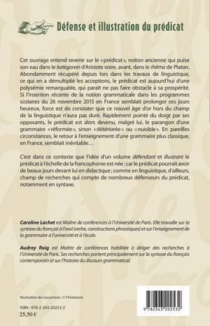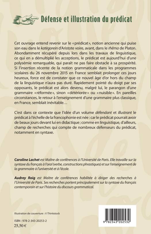 Cet ouvrage entend revenir sur le « prédicat », notion ancienne qui puise son eau dans le katègorein d'Aristote voire, même avant, dans le rhêma de Platon. Abondamment récupéré depuis lors dans les travaux de linguistique, le prédicat est aujourd'hui d'une polysémie remarquable. Si l'insertion récente de la notion grammaticale dans les programmes scolaires du 26 novembre 2015 en France semblait prolonger ces jours heureux, le prédicat, rapidement pointé du doigt par ses opposants, est devenu, malgré lui, le parangon d'une grammaire « réformée », sinon « détériorée » ou « nuisible ». C'est dans ce contexte que l'idée d'un volume défendant et illustrant le prédicat à l'échelle de la francophonie est née.