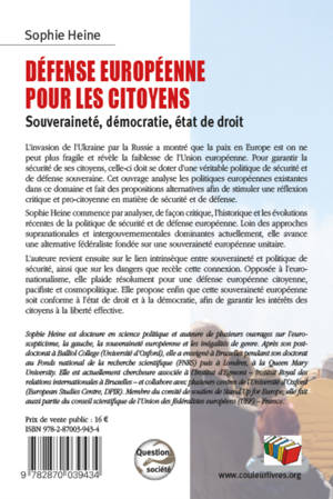 L'auteure revient ensuite sur le lien intrinsèque entre souveraineté et politique de sécurité, ainsi que sur les dangers que recèle cette connexion. Opposée à l'euronationalisme, elle plaide résolument pour une défense européenne citoyenne, pacifiste et cosmopolitique. Elle propose enfin que cette souveraineté européenne soit conforme à l'état de droit et à la démocratie, afin de garantir les intérêts des citoyens à la liberté effective.