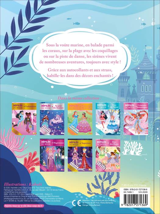 Un cahier souple de 20 pages avec une histoire composée de 9 décors en double-page et 1 décor en page simple avec des sirènes à habiller. Thème aquatique/sirènes. 4 doubles-pages de stickers dont une double-page avec des détails en fer à dorer argent. Et une planche de 96 strass autocollants.