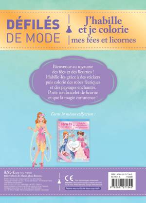 Bienvenue au royaume des fées et des licornes ! Habille-les grâce à des stickers puis colorie des robes féériques et des paysages enchantés. Porte ton bracelet de licorne et que la magie commence !