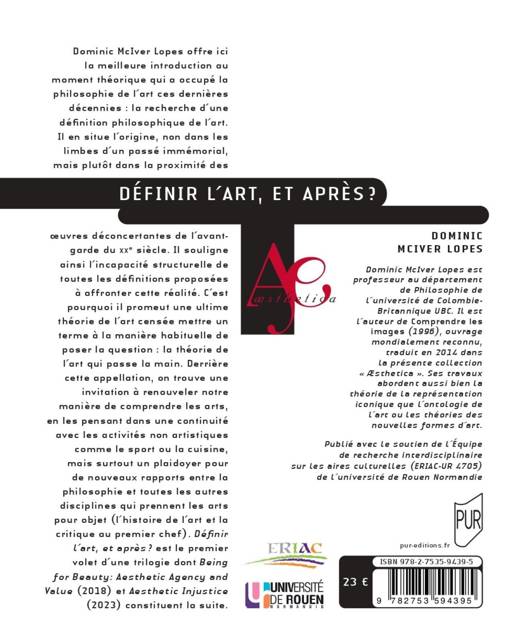 Dominic McIver Lopes offre ici la meilleure introduction au moment théorique qui a occupé la philosophie de l’art ces dernières décennies : la recherche d’une définition philosophique de l’art. Il en situe l’origine, non dans les limbes d’un passé immémorial, mais plutôt dans la proximité des oeuvres déconcertantes de l’avant-garde du XXe siècle. Il souligne ainsi l’incapacité structurelle de toutes les définitions proposées à affronter cette réalité. C’est pourquoi il promeut une ultime théorie de l’art censée mettre un terme à la manière habituelle de poser la question : la théorie de l’art qui passe la main. Derrière cette appellation, on trouve une invitation à renouveler notre manière de comprendre les arts, en les pensant dans une continuité avec les activités non artistiques comme le sport ou la cuisine, mais surtout un plaidoyer pour de nouveaux rapports entre la philosophie et toutes les autres disciplines qui prennent les arts pour objet (l’histoire de l’art et la critique au premier chef). Définir l’art, et après ? est le premier volet d’une trilogie dont Being for Beauty: Aesthetic Agency and Value (2018) et Aesthetic Injustice (2023) constituent la suite.
