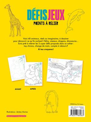Un cahier de 64 pages proposant 50 dessins « points à relier », afin de découvrir ce que cache le dessin mystère. Le défi : dessin à réaliser dans un temps imparti. Niveau de difficulté croissant. Jusqu'à 500 points par dessin. Thématique : les animaux, réels et imaginaires. L'enfant peut ensuite colorier l'animal révélé.