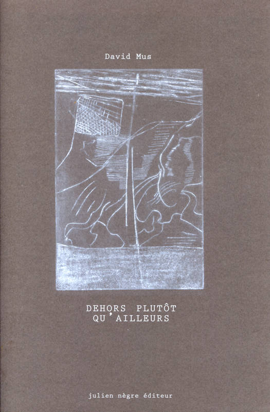Dehors plutôt qu'ailleurs est le premier livre de la collection "Partition". Il s'agit de présenter le texte d'un poète illustré par un artiste. Ainsi David Mus nous emmène à Saint-Pierre-et-Miquelon, où l'auteur est sans cesse partagé entre la mer et la terre qui se font face : sur la page de gauche la mer et sur la page de droite la terre.