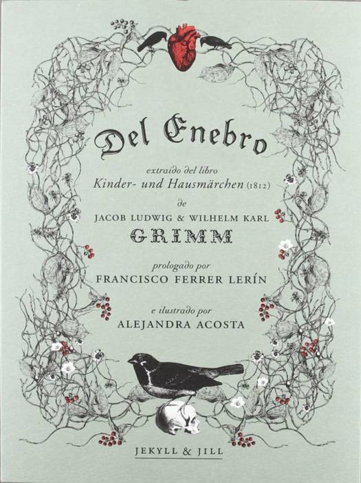 "Del enebro es un sombrío y extrañamente luminoso cuento popular, recopilado hace doscientos años por Jacob Ludwig y Wilhelm Karl Grimm en el libro Kinder- und Hausmärchen (1812), que relata una terrible historia de infanticidio y canibalismo, botánica y ornitología, y también de amor, lealtad y venganza. Esta edición bi lingüe, traducida directamente de la obra original en Plattdeutsch (bajo alemán), ha sido exquisitamente ilustrada por Alejandra Acosta Argomedo (santiago de Chile, 1975), desde las cubiertas y las guardas, hasta el pequeño regalo que esconde el libro en su interior. sus collages, delicados y terribles, engrandecen aún más esta obra original de los hermanos Grimm, enriqueciendo los oscuros matices de la narración. Además, la obra cuenta con un excelente prólogo de Francisco Ferrer Lerín (barcelona, 1942), escritor y experto ornitólogo, en el que se desmenuzan algunos de los aspectos más turbios e interesantes del cuento.