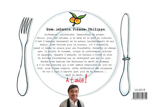 En 90 pages et autant de dessins, Philippe Delestre (journaliste et dessinateur de presse, à la "une" de L'Est Républicain depuis 45 ans) revisite l'univers de la gastronomie. Avec son goût du ridicule qui est l’essence (sûrement) et le moteur (probablement) de son humour, très british pour un Lorrain, 100 % mirabelle. Quand il lâche le crayon pour une fourchette, Delestre ne change pas: il mijote le cocasse, croque le pittoresque, mitonne le saugrenu, déguste l’absurde. Au menu : mise en bouche (préface de Pierre Perret), les clients, le carnet d’adresses, les coulisses, les produits du terroir, les chefs, la carte des vins, les critiques.