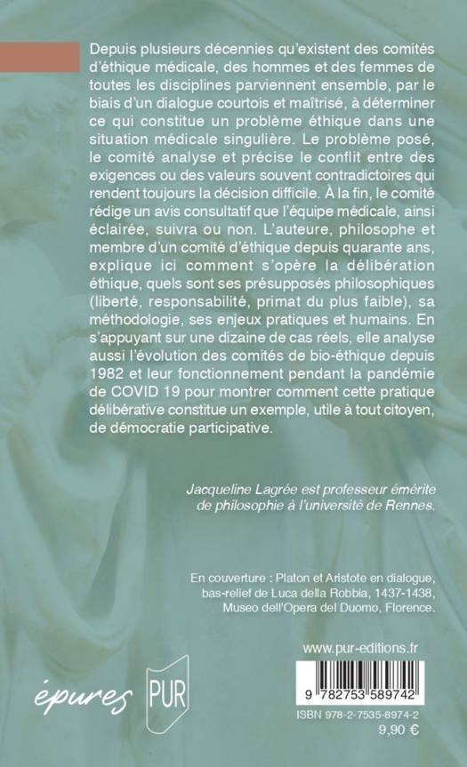 Depuis plusieurs décennies qu’existent des comités d’éthique médicale, des hommes et des femmes de toutes les disciplines parviennent ensemble, par le biais d’un dialogue courtois et maîtrisé, à déterminer ce qui constitue un problème éthique dans une situation médicale singulière. Le problème posé, le comité analyse et précise le conflit entre des exigences ou des valeurs souvent contradictoires qui rendent toujours la décision difficile. À la fin, le comité rédige un avis consultatif que l’équipe médicale, ainsi éclairée, suivra ou non. L’auteure, philosophe et membre d’un comité d’éthique depuis quarante ans, explique ici comment s’opère la délibération éthique, quels sont ses présupposés philosophiques (liberté, responsabilité, primat du plus faible), sa méthodologie, ses enjeux pratiques et humains. En s’appuyant sur une dizaine de cas réels, elle analyse aussi l’évolution des comités de bio-éthique depuis 1982 et leur fonctionnement pendant la pandémie de COVID 19 pour montrer comment cette pratique délibérative constitue un exemple, utile à tout citoyen, de démocratie participative.