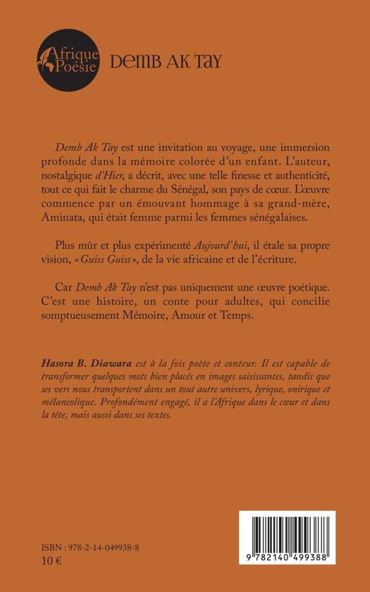 Demb Ak Tay est une invitation au voyage, une immersion profonde dans la mémoire colorée d'un enfant. L'auteur, nostalgique d'Hier, a décrit, avec une telle finesse et authenticité, tout ce qui fait le charme du Sénégal, son pays de coeur. L'oeuvre commence par un émouvant hommage à sa grand-mère, Aminata, qui était femme parmi les femmes sénégalaises. Plus mûr et plus expérimenté Aujourd'hui, il étale sa propre vision, Guiss Guiss, de la vie africaine et de l'écriture. Car Demb Ak Tay n'est pas uniquement une oeuvre poétique. C'est une histoire, un conte pour adultes, qui concilie somptueusement Mémoire, Amour et Temps.