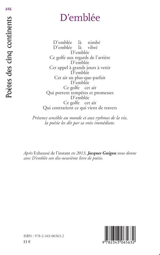 « Présence sensible au monde et aux rythmes de la vie, la poésie les dit par sa voix immédiate. » Après Exhaussé de l'instant en 2013, Jacques Guigou nous donne avec D'emblée son dix-neuvième livre de poésie.