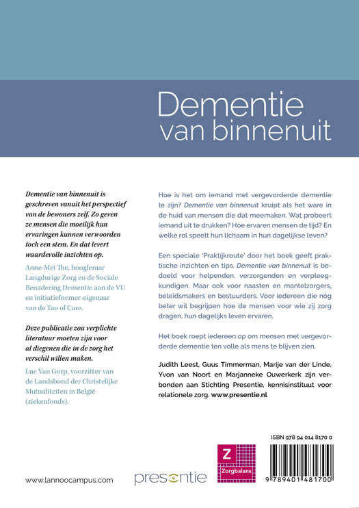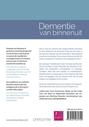 Hoe is het om iemand met vergevorderde dementie te zijn? Dementie van binnenuit kruipt als het ware in de huid van mensen die dat meemaken. Wat probeert iemand uit te drukken? Hoe ervaren mensen de tijd? En welke rol speelt hun lichaam in hun dagelijkse leven? Een speciale 'praktijkroute' door het boek geeft praktische inzichten en tips.