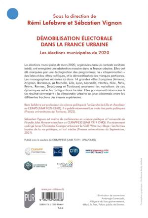 Les élections municipales de mars 2020, organisées dans un contexte sanitaire inédit, ont enregistré une abstention massive dans la France urbaine. Elles ont été marquées par une écologisation des programmes, la « citoyennisation » des listes et des offres politiques, et la démonétisation des marques partisanes. Les monographies réalisées ici dans 14 grandes villes françaises (Amiens, Avignon, Bordeaux, La Rochelle, Lille, Lyon, Marseille, Nantes, Nice, Paris, Reims, Rennes, Strasbourg et Toulouse) analysent les variations de ces dynamiques selon les configurations locales. Elles parviennent néanmoins à un résultat convergent : la démocratie urbaine se joue désormais entre les différentes fractions des classes supérieures.