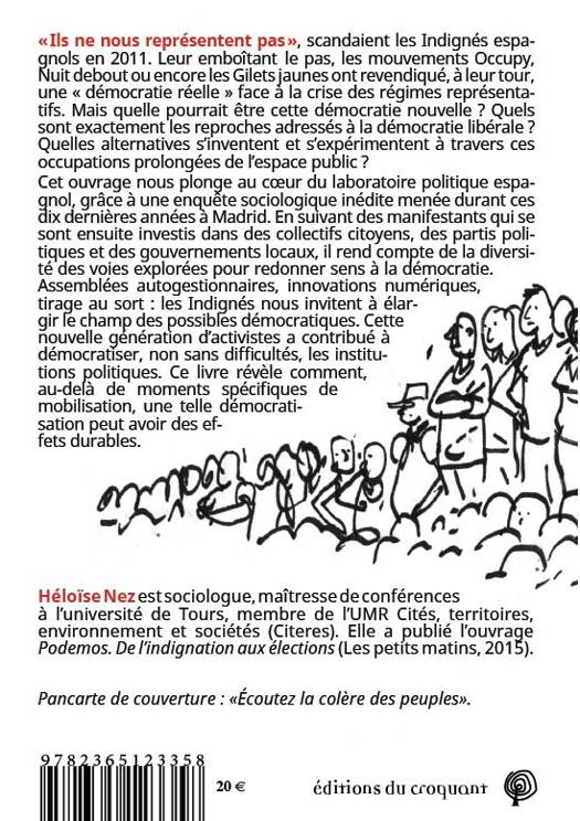 «Â Ils ne nous représentent pas », scandaient les Indignés espagnols en 2011. Leur emboîtant le pas, les mouvements Occupy, Nuit debout ou encore les gilets jaunes revendiquent, depuis une décennie, une «Â démocratie réelle » face à la crise que traversent les régimes représentatifs. Mais à quoi peut bien ressembler cette démocratie nouvelle ? Quels sont exactement les reproches adressés à la démocratie libérale ? Quelles alternatives s’inventent et s’expérimentent à travers les occupations de places publiques ? Cet ouvrage nous plonge au cÅur du laboratoire politique espagnol, à partir d’une enquête sociologique menée pendant dix ans à Madrid. Assemblées autogestionnaires, démocratie participative, innovations numériques, tirage au sort : les Indignés nous invitent à élargir notre imaginaire. Cette nouvelle génération d’activistes a contribué à démocratiser, non sans difficultés, les institutions politiques. Mais une telle démocratisation peut-elle avoir des effets de long terme, au-del