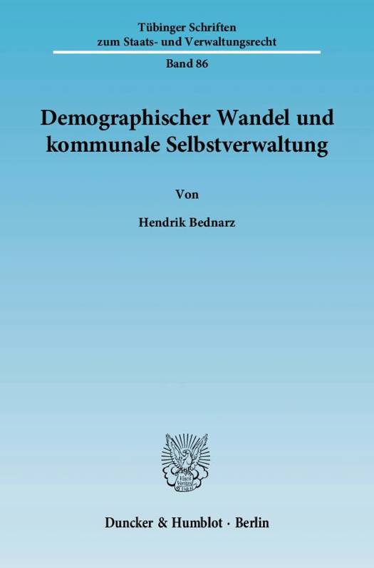 Der demographische Wandel wirft im Hinblick auf die kommunale Selbstverwaltung zahlreiche Rechtsfragen auf. Die direkten Folgen des demographischen Wandels werden im Rahmen der Untersuchung genauso berücksichtigt wie die indirekten, durch Anreizwirkungen ausgelösten Effekte. Anhand einer positiven Analyse des Rechtsrahmens werden Aussagen über dessen Demographietauglichkeit im Hinblick auf die kommunale Selbstverwaltung getroffen und normativ Handlungsempfehlungen abgeleitet. Methodisch wird auch auf die ökonomische Theorie des Rechts zurückgegriffen.