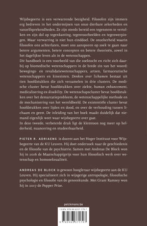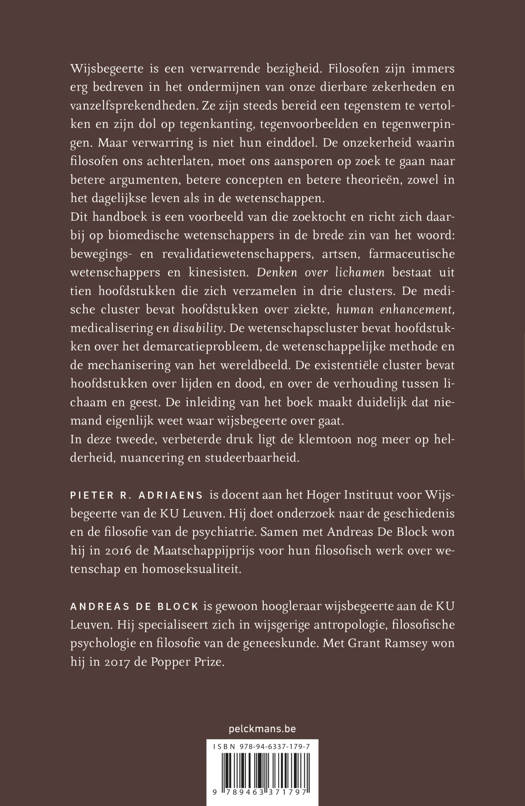 Dit handboek is een voorbeeld van die zoektocht en richt zich daarbij op biomedische wetenschappers in de brede zin van het woord: bewegingsen revalidatiewetenschappers, artsen, farmaceutische wetenschappers en kinesisten. Denken over lichamen bestaat uit tien hoofdstukken die zich verzamelen in drie clusters. De medische cluster bevat hoofdstukken over ziekte, human enhancement, medicalisering en disability. De wetenschapscluster bevat hoofdstukken over het demarcatieprobleem, de wetenschappelijke methode en de mechanisering van het wereldbeeld. De existentiële cluster bevat hoofdstukken over lijden en dood, en over de verhouding tussen lichaam en geest. De inleiding van het boek maakt duidelijk dat niemand eigenlijk weet waar wijsbegeerte over gaat.