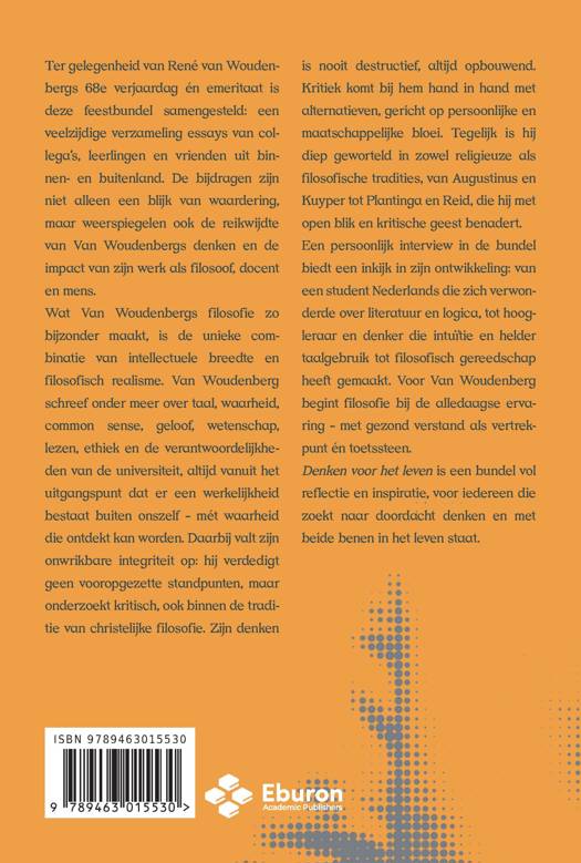 Ter gelegenheid van René van Woudenbergs 68e verjaardag én emeritaat is deze feestbundel samengesteld: een veelzijdige verzameling essays van collega’s, leerlingen en vrienden uit binnen- en buitenland. De bijdragen zijn niet alleen een blijk van waardering, maar weerspiegelen ook de reikwijdte van Van Woudenbergs denken en de impact van zijn werk als filosoof, docent, denker en mens. Wat Van Woudenbergs filosofie zo bijzonder maakt, is de unieke combinatie van intellectuele breedte en filosofisch realisme. Van Woudenberg schreef over taal, waarheid, common sense, geloof, wetenschap, lezen, ethiek en de maatschappelijke rol van de universiteit als instituut, altijd vanuit het uitgangspunt dat er een werkelijkheid bestaat buiten onszelf – mét waarheid die ontdekt kan worden. Daarbij valt zijn onwrikbare integriteit op: hij verdedigt geen vooropgezette standpunten, maar onderzoekt kritisch, ook binnen de traditie van christelijke filosofie. Zijn denken is nooit destructief, altijd opbouwend. Kritiek komt bij hem hand in hand met alternatieven, gericht op persoonlijke en maatschappelijke bloei. Tegelijk is hij diep geworteld in zowel religieuze als filosofische tradities, van Augustinus en Kuyper tot Plantinga en Reid, die hij met open blik en kritische geest benadert. Een persoonlijk interview in de bundel biedt een inkijk in zijn ontwikkeling: van een student Nederlands die zich verwonderde over literatuur en logica, tot hoogleraar en denker die intuïtie en helder taalgebruik tot filosofisch gereedschap heeft gemaakt. Voor Van Woudenberg begint filosofie bij de alledaagse ervaring – met gezond verstand als vertrekpunt én toetssteen. Denken voor het leven is een bundel vol reflectie en inspiratie, voor iedereen die zoekt naar doordacht denken en met beide benen in het leven staat.