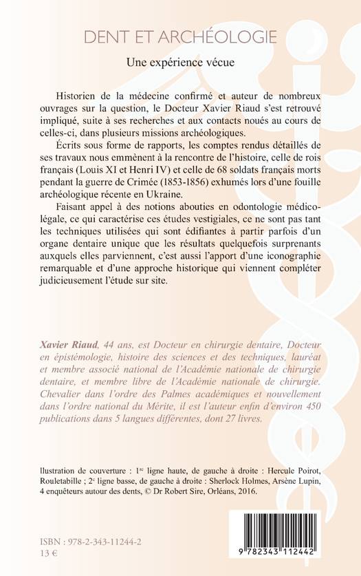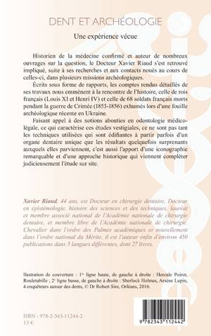 Écrits sous la forme de rapports, les comptes rendus détaillés des travaux du Docteur Xavier Riaud nous emmènent à la rencontre de l'histoire, celle de rois français (Louis XI et Henri IV) et celle de 68 soldats français morts pendant la guerre de Crimée (1853-1856) et exhumés lors d'une fouille archéologique récente en Ukraine. L'auteur fait ici appel à des notions abouties en odontologie médico-légale mais aussi à une iconographie et une approche historique remarquable qui complètent judicieusement l'étude sur site.