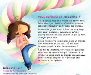Vous connaissez Joséphine ? Cette petite fille en a marre de devoir tout faire vite… se réveiller, s’habiller, prendre son petit déjeuner, se brosser les dents… tu connais ça toi aussi ? Tout va vite, trop vite pour Joséphine, jusqu’à ce qu’elle trouve une clé au pied de son lit qui va tout changer pour elle. Cette histoire va t’emmener dans un monde tout moelleux et qui sait…où toi aussi tu auras plaisir à aller te ressourcer ! A la fin de l’histoire, tu trouveras quelques exercices de relaxation qui t’aideront à te rendre toi aussi dans ce monde en guimauve pour souffler, respirer et t’écouter afin de vivre à ton rythme.