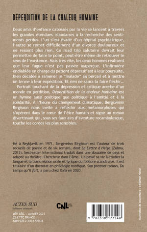 Deux amis d'enfance cabossés par la vie se lancent à travers les grandes étendues islandaises à la recherche des sentiments perdus. L'un s'est évadé d'un hôpital psychiatrique, l'autre se remet difficilement d'un divorce douloureux et ne ressent plus rien. Ce road trip salutaire devrait leur permettre de faire le point, peut-être même de retrouver le sens de l'existence. Mais très vite, les deux hommes réalisent que leur fugue n'est pas passée inaperçue. L'infirmière endiablée en charge du patient dépressif est à leur poursuite, bien décidée à ramener le "malade" au bercail et à mettre un terme à leur expédition. Et rien ne saura la faire fléchir... Portrait touchant de la dépression et critique acerbe d'un monde en perdition, "Déperdition de la chaleur humaine" est un hymne aussi poétique que politique à l'amitié et à la solidarité. À l'heure du changement climatique, Bergsveinn Birgisson nous invite à réfléchir aux métamorphoses qui s'opèrent dans le coeur de l'être humain et signe un roman divertissant qui, sous ses faux airs d'aventure rocambolesque, touche les cordes les plus sensibles.