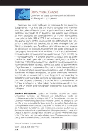 Comment les partis politiques se saisissent-ils des questions européennes ? Voici étudiée l'adaptation et les stratégies des pays européens au développement de l'U.E. Les idées d'une "européanisation" croissante et d'une montée de l'euroscepticisme sont remises en cause. Comment les partis dominants développent-ils des stratégies pour éviter le conflit sur l'intégration européenne ? Maintenir des lignes politiques floues et nationaliser cet enjeu permet aux partis d'agir librement au niveau européen, tout en évitant une politisation de l'U.E; on interdit aux citoyens ordinaires d'accroitre leur connaissance de l'UE par la critique et le débat public.