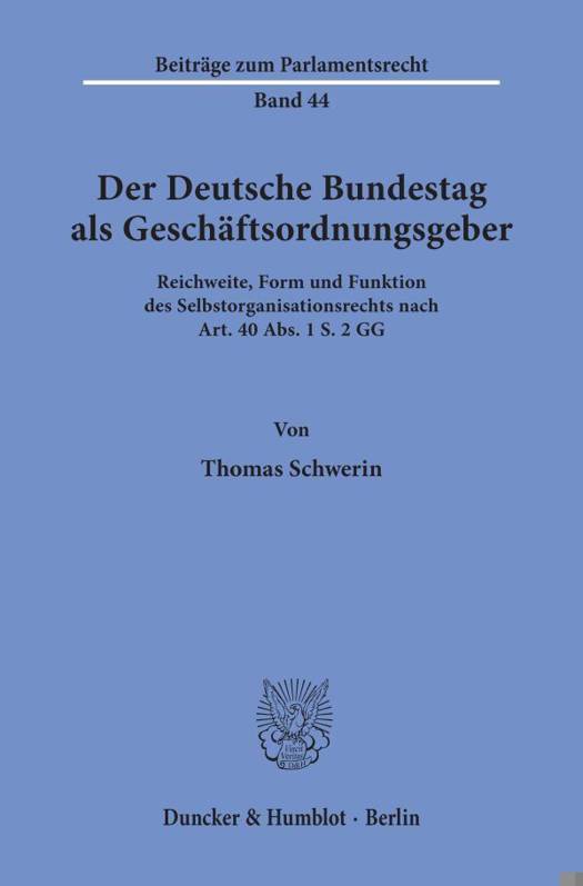 Untersucht werden die Beziehungen und mannigfachen Wechselwirkungen zwischen dem parlamentarischen Selbstorganisationsrecht und anderen Rechtsquellen. Dabei wird die Bedeutung des Selbstorganisationsrechts als konkretisiertes Verfassungsrecht hervorgehoben. Auch wird aufgezeigt, daß strikt an der funktionellen Unterscheidung zwischen dem Bundestag als Gesetzgeber und als Geschäftsordnungsgeber festzuhalten ist. Besonderes Augenmerk legt Schwerin auf die Fraktions- und Ausschußgliederung, wobei sich die Abgeordnetengruppe ohne Fraktionsstatus als Sonderproblem darstellt. Für die Frage der Delegation von Befugnissen auf Bundestagsausschüsse wird ein neuer Ansatz entwickelt. Der Verfasser wendet sich ferner der Frage nach den Rechtsfolgen von Geschäftsordnungsverstößen zu und widerspricht der gängigen These von deren genereller Unbeachtlichkeit. Schließlich wird das Verhältnis der selbstorganisationsrechtlichen Rechtsquellen zueinander behandelt und die These zum Vorrang und Vorbehalt der Geschäftsordnung dargelegt.