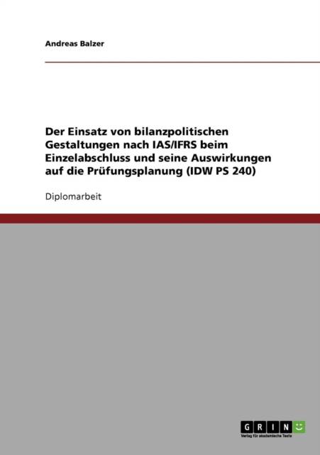 Diplomarbeit aus dem Jahr 2007 im Fachbereich BWL - Rechnungswesen, Bilanzierung, Steuern, Note: 1,7, Fachhochschule Münster, Sprache: Deutsch, Abstract: Diese Arbeit dient primär die bilanzpolitischen Möglichkeiten nach IFRS zu analysieren. Dabei werden undurchsichtige und gefährliche Formen der Bilanzpolitik nach IAS/IFRS besonderer Aufmerksamkeit geschenkt.Die möglichen Auswirkungen von bilanzpolitischen Aktivitäten auf die Prüfungsplanung werden in einem besonderen Kapitel gewürdigt. Dabei werden, die in der Fachliteratur bisher kaum diskutierte Problemstellung, durch eine strukturierte und analytische Vorgehensweise aufbereitet.