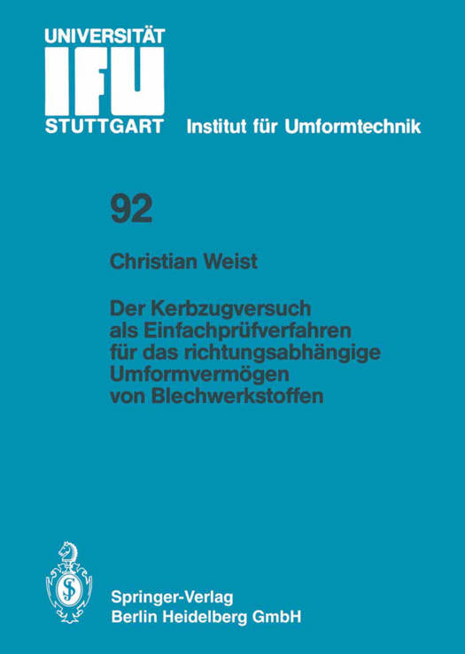 Die vorliegende Arbeit enstand wahrend meiner Tatigkeit als wissensehaftlieher Mitarbeiter am Institut fur Umformteehnik der Universitat Stuttgart. Herrn Professor Dr. -Ing. K. Lange moehte ieh sehr herzlieh fur das mir entgegengebraehte Vertrauen und seine Unterstutzung bei der Anfertigung dieser Arbeit danken. Herrn Dr. -Ing. habil. K. Pohlandt danke ieh fur seine Betreu- ung und die Durehsieht der Arbeit. Ebenso gilt mein Dank allen Mitarbeiterinnen und Mitarbeitern es Institutes fur Umformteehnik, die dureh ihre Hilfe zum Ge- lingen der Arbeit beigetragen haben. Der Firma Aluminium-Walzwerke Singen GmbH danke ieh fur die Durehfuhrung von ehemisehen Analysen. Die Mittel zur Durehfuhrung dieser Untersuehung wurden von der Deutsehen Forsehungsgemeinsehaft zur Verfugung gestellt. Stuttgart, im Januar 1986 Christian Weist INHALTSVERZEICHNIS Begriffe und Formelzeichen 11 1 Einleitung 13 2 Stand der Forschung 15 2. 1 Korrelation der Kerbzugdehnung mit der Umformeignung und anderen WerkstoffkenngroBen 15 2. 2 EinfluB des Gefliges auf WerkstoffkenngroBen 16 2. 3 Zur Allgemeingliltigkeit des Kerbzugversuchs 19 2. 4 EinfluB der Kerbgeometrie auf die Kerbzugdehnung 20 2. 5 Vorteile der KenngroBe Kerbzugdehnung 23 3 Experimentelle Durchflihrung 25 3. 1 Werkstoffe . - . . . . - - 25 3. 2 Probenform und Versuchsdurchflihrung 26 4 Versuchsergebnisse und Auswertung 29 4. 1 Abhingigkeit der Kerbzugdehnung on der Kerbtiefe und der Probenlage zur Walzrichtung 29 4. 2 Ermittlung der optimalen Kerbgeometrie 33 4. 3 Eigenschaften der KenngroBe Kerbzugdehnung 47 4. 3. 1 EinfluB der Blechdicke auf die Kerbzugdehnung 49 4. 3. 2 Vergleich verschiedener Kerbgeometrien 51 4. 3.