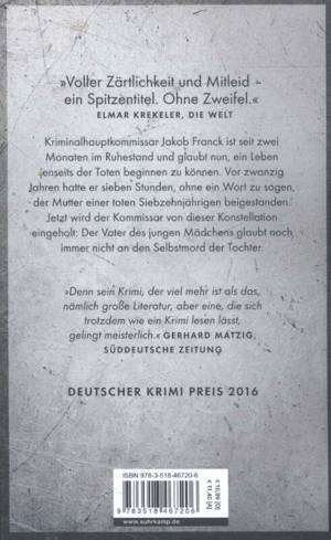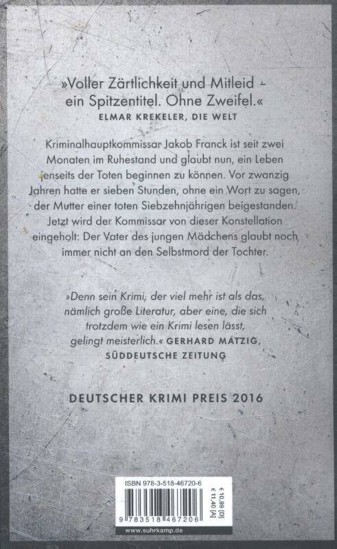 Kriminalhauptkommissar Jakob Franck ist seit zwei Monaten im Ruhestand und glaubt nun, ein Leben jenseits der Toten beginnen zu können. Vor zwanzig Jahren hatte er sieben Stunden, ohne ein Wort zu sagen, der Mutter einer toten Siebzehnjährigen beigestanden. Jetzt wird der Kommissar von dieser Konstellation eingeholt: Ludwig Winther tritt mit ihm in Kontakt; er ist der Vater des jungen Mädchens, das sich umgebracht haben soll, und Ehemann jener Frau, der Franck so viel Aufmerksamkeit widmete.