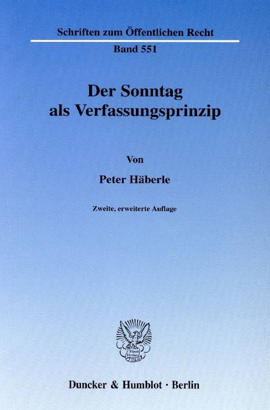 "In der Sache [...] legt Häberle eine Schrift von grundlegender Bedeutung vor, die die kulturelle, verfassungsrechtliche und rechtspolitische Dimension des Sonntags-Themas umfassend aufzeigt und sich durch eine präzise Analyse der Wechselbeziehungen zwischen dem Verfassungsrecht und dem einfachen Recht des Sonntagsschutzes auszeichnet. [...]" A. Pahlke, in: NVwZ 1991, S. 152