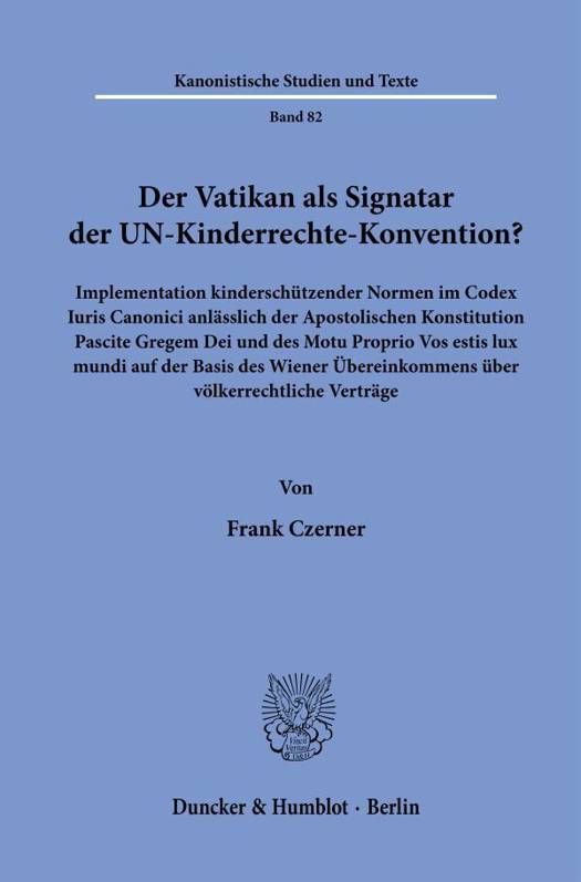 English summary: The Vatican as signatory to the UN Convention on the Rights of the Child? The signing of the UN Convention on the Rights of the Child by the Holy See and its implications under international law and church law are the focus of this work. The Vienna Convention on the Law of Treaties and the optimization of child protection through the Apostolic Constitution PASCITE GREGEM DEI are also analyzed in relation to the issue of abuse. This work is part II of a research project in Rome on the canonical reception of child reception of child protection (Gorres Society, Campo Santo Teutonico). German description: Wer hat die Konvention der Vereinten Nationen zum Schutz von Kindern unterzeichnet - der Vatikan oder der Heilige Stuhl? Welche volkerrechtlichen und kirchenrechtlichen Folgerungen sind aus dieser Antwort abzuleiten? Welche Rolle spielt die Wiener Konvention uber die Auslegung und die Einhaltung volkerrechtlicher Vertrage fur die romisch-katholische Kirche im Hinblick auf den Kinderschutz? Mit der Apostolischen Konstitution PASCITE GREGEM DEI (2021, Czerner, KST 76) und mit dem Motu Proprio VOS ESTIS LUX MUNDI ist ein Paradigmenwechsel zugunsten des Opferschutzes, insbesondere im Kontext des Missbrauchs, erfolgt. Mit diesem Band legt Frank Czerner den zweiten Beitrag zu seinem Forschungs-Freisemester in Rom (Institut der Gorres-Gesellschaft am Campo Santo Teutonico) mit volkerrechtlichem Schwerpunkt auf der kanonischen Rezeption des Kinderschutzes vor. Zentrales Ergebnis ist die (auch) volkerrechtliche Verpflichtung des Heiligen Stuhls zum (optimierten) Schutz von Kindern.