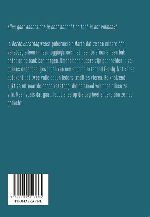 In de klassieke kerstfilm It’s a wonderful life wenst hoofdpersoon George Bailey dat hij nooit was geboren (‘I wish I’d never been born!’) en in Home Alone hoopt Kevin dat zijn familie zal verdwijnen (‘I wish my family would disappear!’). In Derde kerstdag wenst pubermeisje Marte dat ze tenminsteéén kerstdag alleen in haar joggingbroek met haar telefoon en een bakje patat op de bank kan hangen. Omdat haar ouders zijn gescheiden is ze opeens onderdeel geworden van een enorme extended family. Met kerst betekent dat twee volle dagen ‘de traditie’ vieren met mensen waar ze tegen haar zin mee zit opgescheept. Reikhalzend kijkt ze uit naar de derde kerstdag, die helemaal van haar alleen zal zijn. Maar die dag loopt alles anders dan ze had gedacht…