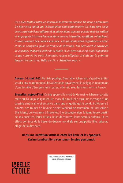 Bruxelles, aujourd’hui. Karine Lambert apprend la mort de Germaine, sa mère, qu’elle n’a pas vue depuis vingt ans. Surgit alors chez la romancière le désir de comprendre qui était cette femme qui ne lui a jamais dit qu’elle l’aimait. Ni avec ses mains, ni avec ses yeux, ni avec ses mots. Encore moins avec ses baisers. Au fil des mois, son enquête la conduit d'Odessa à Anvers, de Marseille à Ellis Island, de New York à Bruxelles. Elle découvre le tumultueux destin de ses ancêtres, leurs déchirures, leurs secrets enfouis. La vie que sa mère ne lui a pas racontée, elle décide de l’imaginer.