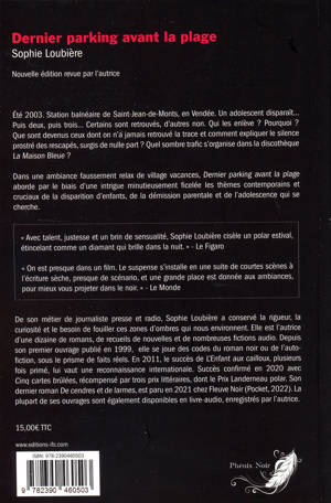 Été 2003. Station balnéaire de Saint-Jean-de-Monts, en Vendée. Un adolescent disparaît... Puis deux, puis trois... Certains sont retrouvés, d’autres non. Qui les enlève ? Pourquoi ? Que sont devenus ceux dont on n’a jamais retrouvé la trace et comment expliquer le silence prostré des rescapés, surgis de nulle part ? Quel sombre trafic s’organise dans la discothèque La Maison Bleue ? Dans une ambiance faussement relax de village vacances, Dernier parking avant la plage aborde par le biais d’une intrigue minutieusement ficelée les thèmes contemporains et cruciaux de la disparition d’enfants, de la démission parentale et de l’adolescence qui se cherche. « Avec talent, justesse et un brin de sensualité, Sophie Loubière cisèle un polar estival, étincelant comme un diamant qui brille dans la nuit. » - Le Figaro. « On est presque dans un film. Le suspense s’installe en une suite de courtes scènes à l’écriture sèche, presque de scénario, et une grande place est donnée aux ambiances, pour mieux vous projeter dans le noir. » - Le Monde. « Choc narratif : c’est un puzzle. En temps réel. On est derrière chaque personnage, dans chaque action. L’écriture est précise et exigeante : mise en exergue du petit détail, descriptions, réalisme et subtilité. Vous serez vite pris au collet dans cette haletante chasse à l’homme. » - Rolling Stone.