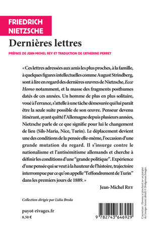 Ces lettres adressées aux amis les plus proches, à la famille, à quelques figures intellectuelles comme August Strindberg, sont à lire en regard des dernières oeuvres de Nietzsche. Un homme de plus en plus solitaire, voué à l'errance, s'attelle à une tâche démesurée, seule suite possible de son oeuvre. Devenu itinérant, Nietzsche parle de ce que signifie pour lui le changement de lieu. Le déplacement devient l'occasion d'une grande mutation du regard. Il s'insurge contre le nationalisme et l'antisémitisme et cherche à définir les conditions d'une grande politique. Expérience d'une pensée qui se veut à la hauteur de l'histoire, trajectoire interrompue par ce qu'on appelle l'effondrement à Turin dans les premiers jours de 1889.