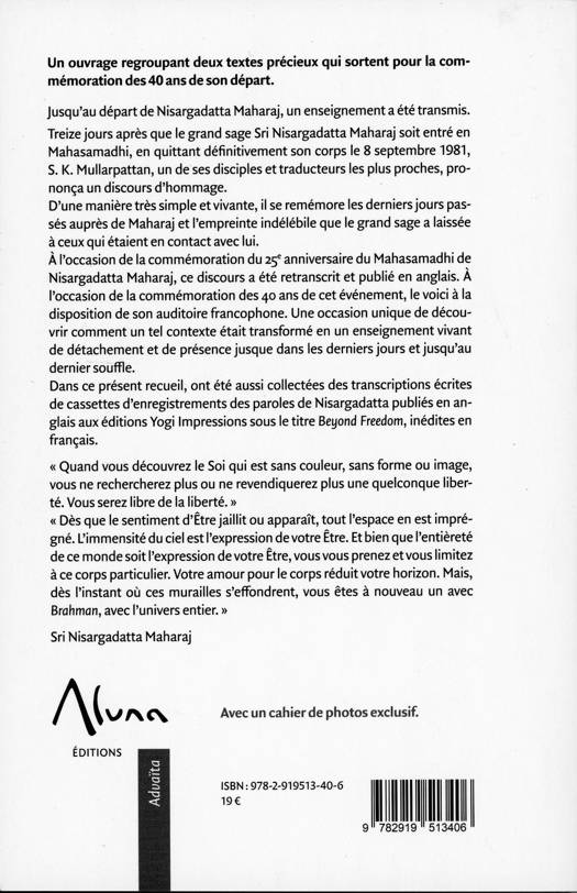 Jusqu’au départ de Nisargadatta Maharaj réside un enseignement. Treize jours après que le grand sage Sri Nisargadatta Maharaj soit entré en Mahasamadhi, en quittant définitivement son corps le 8 septembre 1981, S.K. Mullarpattan, un de ces tous proches disciples et traducteurs, prononça un discours d’hommage. D’une manière très simple et vivante, il se remémore les derniers jours passés auprès de Maharaj et l’empreinte indélébile que le grand sage a laissée à ceux qui étaient en contact avec lui. À l’occasion de la commémoration du 25e anniversaire du Mahasamadhi de Nisargadatta Maharaj, ce discours a été retranscrit et publié en anglais. À l’occasion de la commémoration des 40 ans de cet événement, le voici à la disposition de son auditoire francophone. Une occasion unique de découvrir comment un tel contexte était transformé en un enseignement vivant de détachement et de présence jusque dans les derniers jours, jusque dans le dernier souffle. Dans ce présent recueil, ont été aussi collectées des transcriptions écrites de cassettes d’enregistrements des paroles de Nisargadatta publiés en anglais aux éditions Yogi impressions sous le titre Beyond Freedom, inédites en français. « Quand vous découvrez le Soi qui est sans couleur, sans forme ou image, vous ne rechercherez plus ou ne revendiquerez plus une quelconque liberté. Vous serez libre de la liberté. » « Dès que le sentiment d’Être jaillit ou apparaît, tout l’espace en est imprégné. L’immensité du ciel est l’expression de votre Être. Et bien que l’entièreté de ce monde soit l’expression de votre Être, vous vous prenez et vous limitez à ce corps particulier. Votre amour pour le corps réduit votre horizon. Mais, dès l’instant où ces murailles s’effondrent, vous êtes à nouveau un avec Brahman, avec l’univers entier. »