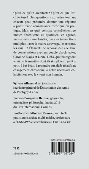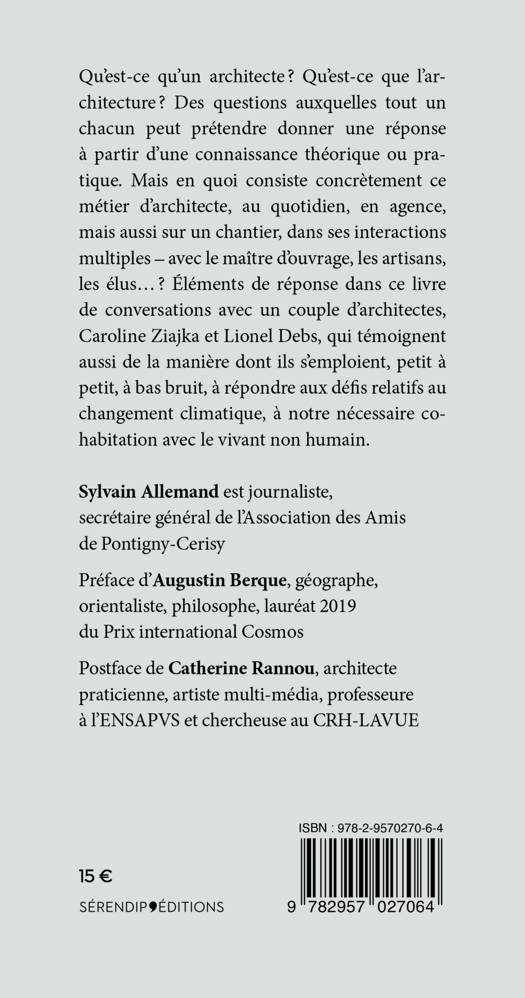 Qu'est-ce qu'un architecte ? Qu'est-ce que l'architecture ? Des questions auxquelles tout un chacun peut prétendre donner une réponse à partir d'une connaissance théorique ou pratique. Mais en quoi consiste concrètement ce métier d'architecte, au quotidien, en agence, mais aussi sur un chantier, dans ses interactions multiples - avec le maître d'ouvrage, les artisans, les élus... ? Eléments de réponse dans ce livre de conversations avec un couple d'architectes, Caroline Ziajka et Lionel Debs qui témoignent aussi de la manière dont ils s'emploient, petit à petit, à bas bruit, à répondre aux défis relatifs au changement climatique, à notre nécessaire cohabitation avec le vivant non humain.