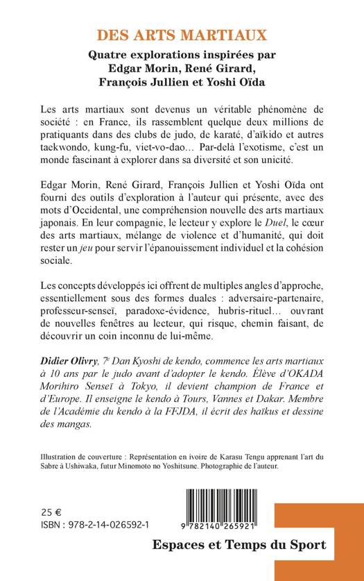 Les arts martiaux sont devenus un véritable phénomène de société : en France, ils rassemblent quelque deux millions de pratiquants dans des clubs de judo, de karaté, d'aïkido et autres taekwondo, kung-fu, viet-vo-dao. Par-delà l'exotisme, c'est un monde fascinant à explorer dans sa diversité et son unicité. Edgar Morin, René Girard, François Jullien et Yoshi Oïda ont fourni des outils d'exploration à l'auteur qui présente, avec des mots d'Occidental, une compréhension nouvelle des arts martiaux japonais. En leur compagnie, le lecteur y explore le Duel, le coeur des arts martiaux, mélange de violence et d'humanité, qui doit rester un jeu pour servir l'épanouissement individuel et la cohésion sociale. Les concepts développés ici offrent de multiples angles d'approche, essentiellement sous des formes duales : adversaire-partenaire, professeur-senseï, paradoxe-évidence, hubris-rituel...ouvrant de nouvelles fenêtres au lecteur, qui risque, chemin faisant, de découvrir un coin inconnu de lui-même.