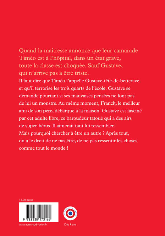 Quand la maîtresse annonce que leur camarade Timéo est à l'hôpital, dans un état grave, toute la classe est choquée. Sauf Gustave, qui n'arrive pas à être triste. Il faut dire que Timéo l'appelle Gustave-tête-de-betterave et qu'il terrorise les trois quarts de l'école. Gustave se demande pourtant si ses mauvaises pensées ne font pas de lui un monstre. Au même moment, Franck, le meilleur ami de son père, débarque à la maison. Gustave est fasciné par cet adulte libre, ce baroudeur tatoué qui a des airs de super-héros. Il aimerait tant lui ressembler. Mais pourquoi chercher à être un autre ? Après tout, on a le droit de ne pas être, de ne pas ressentir les choses comme tout le monde !
