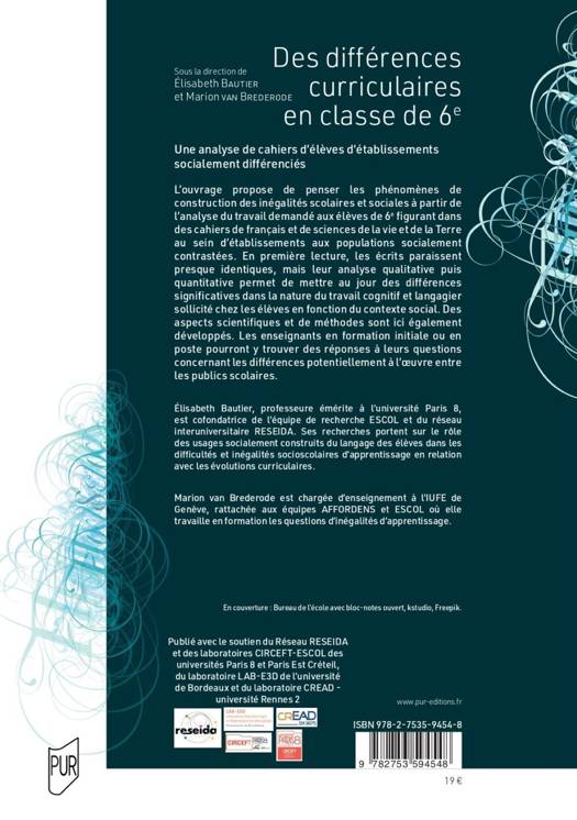 L’ouvrage propose de penser les phénomènes de construction des inégalités scolaires et sociales à partir de l’analyse du travail demandé aux élèves de 6e figurant dans des cahiers de français et de sciences de la vie et de la Terre au sein d’établissements aux populations socialement contrastées. En première lecture, les écrits paraissent presque identiques, mais leur analyse qualitative puis quantitative permet de mettre au jour des différences significatives dans la nature du travail cognitif et langagier sollicité chez les élèves en fonction du contexte social. Des aspects scientifiques et de méthodes sont ici également développés. Les enseignants en formation initiale ou en poste pourront y trouver des réponses à leurs questions concernant les différences potentiellement à l’oeuvre entre les publics scolaires.