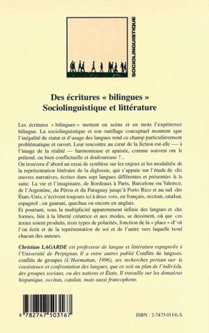 Les écritures " bilingues " mettent en scène et en mots l'expérience bilingue. La sociolinguistique montre que l'inégalité de statut et d'usage des langues rend ce champ particulièrement problématique et ouvert. Leur rencontre au cur de la fiction est-elle - à l'image de la réalité - harmonieuse et apaisée ou bien conflictuelle et douloureuse ? Pour cet essai de synthèse sur les enjeux et les modalités de la représentation littéraire de la diglossie, l'auteur s'appuie sur l'étude de dix uvres narratives, écrites dans sept langues différentes .