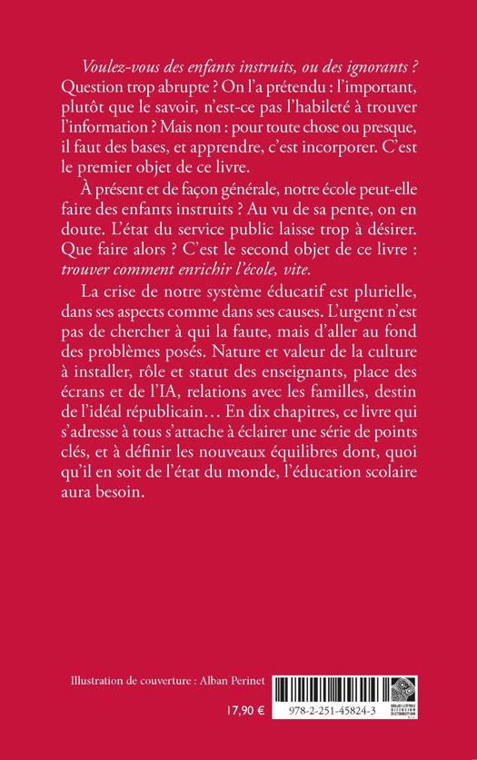 Voulez-vous des enfants instruits, ou des ignorants ? Question trop abrupte ? On l’a prétendu : l’important, plutôt que le savoir, n’est-ce pas l’habileté à trouver l’information ? Mais non : pour toute chose ou presque, il faut des bases, et apprendre, c’est incorporer. C’est le premier objet de ce livre. À présent et de façon générale, notre école peut-elle faire des enfants instruits ? Au vu de sa pente, on en doute. L’état du service public laisse trop à désirer. Que faire alors ? C’est le second objet de ce livre : trouver comment enrichir l’école, vite.
