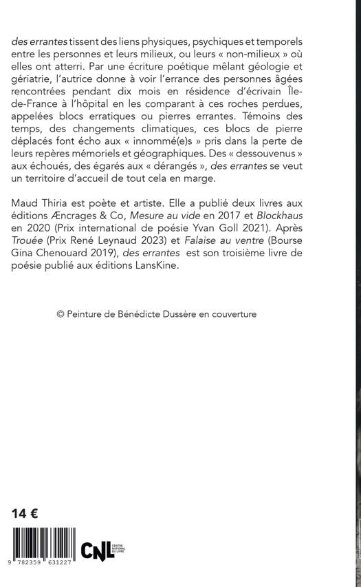 des errantes tissent des liens physiques, psychiques et temporels entre les personnes et leurs milieux, ou leurs « non-milieux » où elles ont atterri. Par une écriture poétique mêlant géologie et gériatrie, l’autrice donne à voir l’errance des personnes âgées rencontrées pendant dix mois en résidence d’écrivain Île-de-France à l’hôpital en les comparant à ces roches perdues, appelées blocs erratiques ou pierres errantes. Témoins des temps, des changements climatiques, ces blocs de pierre déplacés font écho aux « innom-mé(e)s » pris dans la perte de leurs repères mémoriels et géographiques. Des « dessouvenus » aux échoués, des égarés aux « dérangés », des errantes se veut un territoire d’accueil de tout cela en marge.<br />