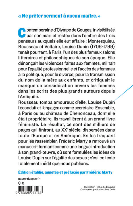 Contemporaine d'Olympe de Gouges, invisibilisée par son mari et restée dans l'ombre des trois penseurs auxquels elle eut affaire : Montesquieu, Rousseau et Voltaire, Louise Dupin (1706-1799) tenait pourtant, à Paris, l'un des plus fameux salons littéraires et philosophiques de son époque. Elle dénonçait les violences faites aux femmes, militait pour l'égalité professionnelle et l'accès des femmes à la politique, pour le divorce, pour la transmission du nom de la mère aux enfants, et critiquait le manque de considération envers les femmes dans les écrits des plus grands auteurs depuis l'Antiquité. Rousseau tomba amoureux d'elle, Louise Dupin l'éconduit puis l'engagea comme secrétaire. Ensemble, à Paris ou au château de Chenonceau, dont elle était propriétaire, ils travaillèrent à un grand livre féministe. Le résultat, ce sont des milliers de pages qui finiront, au XXe siècle, dispersées dans toute l'Europe et en Amérique. En les traquant pour les rassembler, Frédéric Marty a retrouvé un manuscrit formant comme une longue introduction à son grand-oeuvre, où sont formulées les idées de Louise Dupin sur l'égalité des sexes ; c'est ce texte totalement inédit que nous publions.