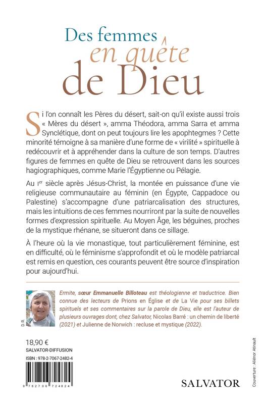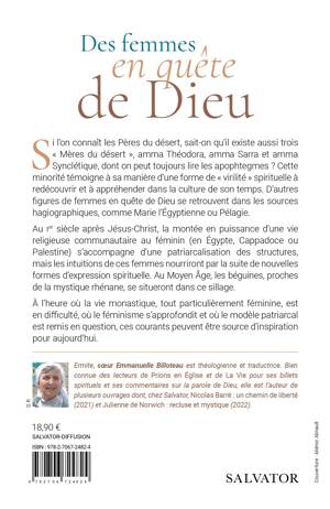 Si l'on connaît les Pères du désert, sait-on qu'il existe aussi trois Mères du désert, Amma Théodora, Amma Sara et Amma Synclétique, dont on peut toujours lire les apophtegmes ? Cette minorité témoigne à sa manière d'une forme de virilité spirituelle à redécouvrir et à appréhender dans la culture de son temps. D'autres figures se retrouvent aussi dans les sources hagiographiques, comme Marie l'Égyptienne ou Pélagie. Mais si la montée en puissance du cénobitisme féminin (en Égypte, Cappadoce ou Palestine) s'accompagne d'une patriarcalisation des structures, de nouvelles formes de ce type d'expressions spirituelles vont apparaître au Moyen Âge avec les béguines, proches de la mystique rhénane. À l'heure où la vie monastique, tout particulièrement féminine, est en difficulté, où le féminisme s'approfondit et où le modèle patriarcal est remis en question, ces courants spirituels peuvent être source d'inspiration pour aujourd'hui. AUTEUR Ermite, soeur Emmanuelle Billoteau est théologienne et traductrice. Bien connue des lecteurs de Prions en Église et de La Vie pour ses billets spirituels et ses commentaires sur la parole de Dieu, elle est l'auteur de plusieurs ouvrages dont, chez Salvator, Nicolas Barré : un chemin de liberté (2021) et Julienne de Norwich : recluse et mystique (2022).