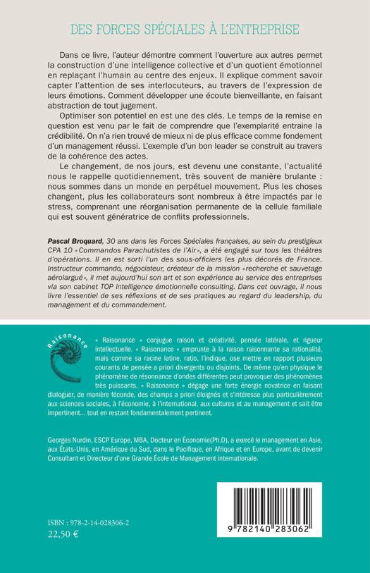Dans cet ouvrage, l'auteur démontre comment l'ouverture aux autres permet la construction d'une intelligence collective et d'un quotient émotionnel en replaçant l'humain au centre des enjeux. Il explique comment savoir capter l'attention de ses interlocuteurs, au travers de l'expression de leurs émotions. Comment développer une écoute bienveillante, en faisant abstraction de tout jugement. Optimiser son potentiel en est une des clés. Le temps de la remise en question est venu par le fait de comprendre que l'exemplarité entraine la crédibilité. On n'a rien trouvé de mieux ni de plus efficace comme fondement d'un management réussi. L'exemple d'un bon leader se construit au travers de la cohérence des actes. Le changement, de nos jours, est devenu une constante, l'actualité nous le rappelle quotidiennement, très souvent de manière brulante: nous sommes dans un monde en perpétuel mouvement. Plus les choses changent, plus les collaborateurs sont nombreux à être impactés par le stress, comprenant une réorganisation permanente de la cellule familiale qui est souvent génératrice de conflits professionnels.