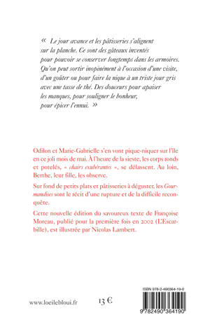 Odilon et Marie-Gabrielle s'en vont pique-niquer sur l'île en ce joli mois de mai. À l'heure de la sieste, les corps ronds et potelés, « chairs exubérantes », se délassent. Au loin, Berthe, leur fille, les observe. Sur fond de petits plats et pâtisseries à déguster, Des Gourmandises sur l'étagère sont le récit d'une rupture et de la difficile reconquête.