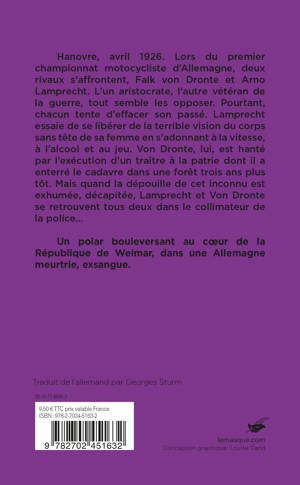 Hanovre, avril 1926. Lors du premier championnat motocycliste d’Allemagne, deux rivaux s’affrontent, Falk von Dronte et Arno Lamprecht. L’un aristocrate, l’autre vétéran de la guerre, tout semble les opposer. Pourtant, chacun tente d’effacer son passé. Lamprecht essaie de se libérer de la terrible vision du corps sans tête de sa femme en s’adonnant à la vitesse, à l’alcool et au jeu. Von Dronte, lui, est hanté par l’exécution d’un traître à la patrie dont il a enterré le cadavre dans une forêt trois ans plus tôt. Mais quand la dépouille de cet inconnu est exhumée, décapitée, Lamprecht et Von Dronte se retrouvent tous deux dans le collimateur de la police…