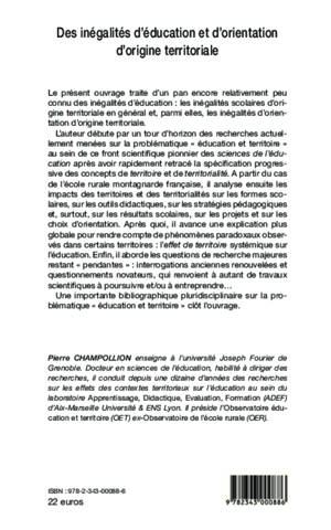 Cet ouvrage traite d'un pan encore relativement peu connu des inégalités d'éducation. L'auteur débute par un tour d'horizon des recherches actuellement menées sur la problématique "éducation et territoire". A partir du cas de l'école rurale montagnarde française, il analyse ensuite les impacts des territoires et des territorialités sur les formes scolaires, les outils didactiques, les stratégies pédagogiques, et surtout sur les résultats scolaires, les projets et les choix d'orientation.