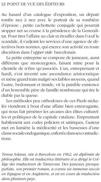 Au hasard d'un catalogue d'exposition, un député tombe nez à nez avec le portrait de sa rombière d'épouse ; petite cachotterie conjugale qui pourrait stopper net sa course à la présidence de la Generalitat. Pour tirer l'affaire au clair et étouffer dans l'oeuf le scandale, il s'adjoint les services d'une agence de détectives hors normes, qui exerce son activité en toute discrétion dans l'upper side barcelonais. La petite entreprise se compose de jumeaux, aussi différents que monozygotes, faisant mine pour la clientèle de n'être qu'associés. L'un, entreprenant et hardi, s'est inventé une ascendance aristocratique et mène grand train malgré ses faibles moyens, quand l'autre, bedonnant et timide, vit la paisible existence d'un honorable père de famille nombreuse qui tire le diable par la queue. Les méthodes peu orthodoxes de ces Pieds nickelés viendront à bout d'une affaire bien extravagante, qui nous fait pénétrer les arcanes des élites culturelles et politiques de la capitale catalane. Empruntant habilement aux codes policiers et satiriques, l'auteur met en lumière la médiocrité et les bassesses d'une classe sociale endogamique, enferrée dans ses contradictions.